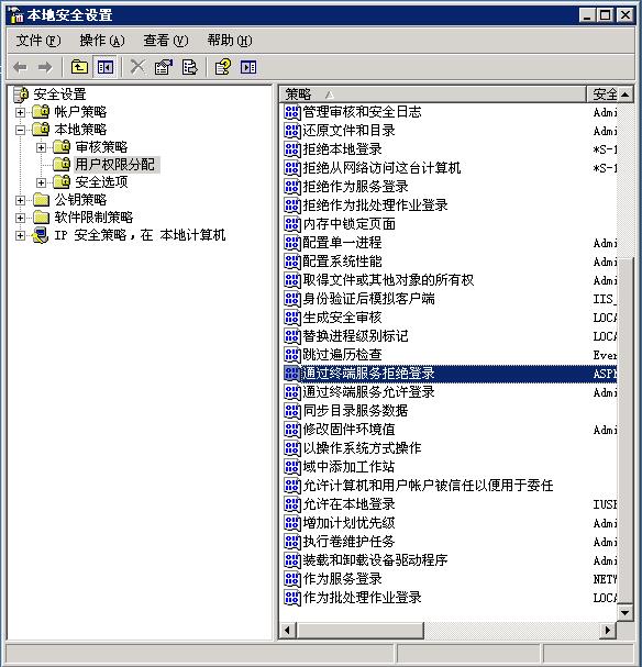 windows2003下禁止用户远程登录的方法如下: 打开控制面板 > 管理工具 > 本地安全策略 安全策略-->本地策略-->用户权限分配-->通过终端服务拒绝登录,在里面添加想要禁止远程的用户可以达到让这个账户无法远程 ...